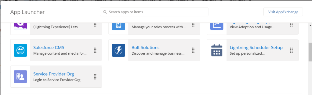 - Click on App Launcher. You should see an app with same name as your connected app (‘Service Provider Org’ in our case) as shown in below screenshot. Click on this app and you should be able to login to service provider.