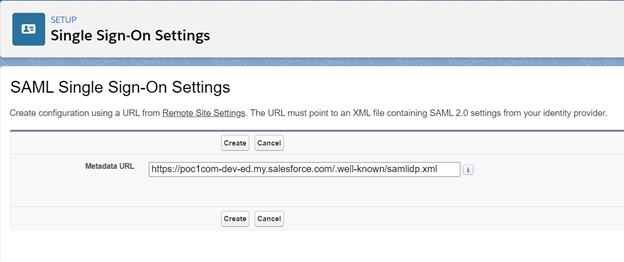 - Create a remote site setting for the ‘Salesforce Identity’ URL you just saved in previous step from identity provider page from identity provider org. This remote site setting is needed to create SAML entry.